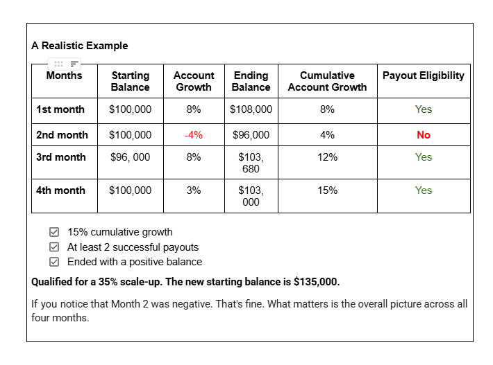 | Positive Balance | Your account must end the 4-month period in profit. You can’t scale up while you’re in drawdown. |